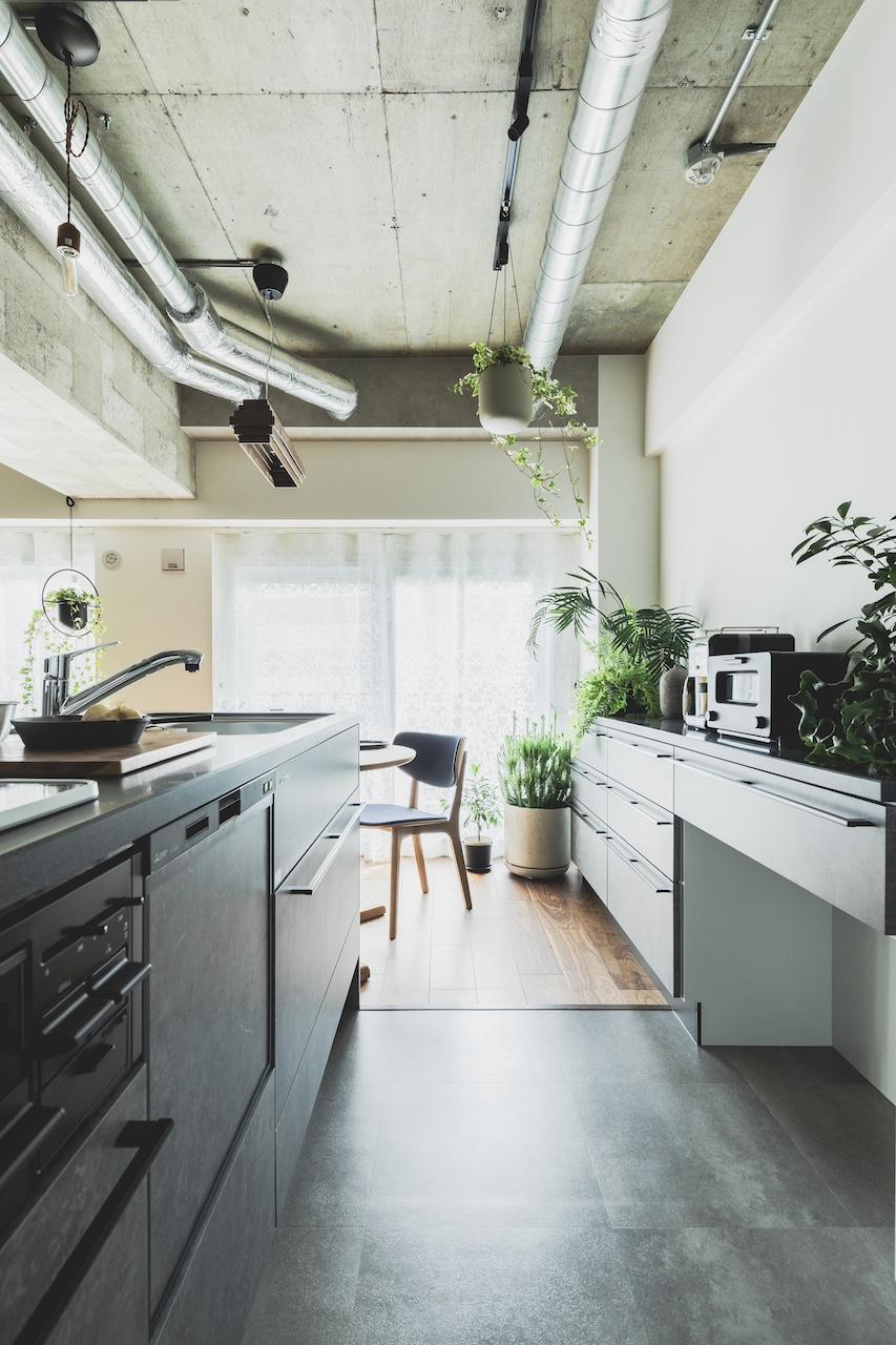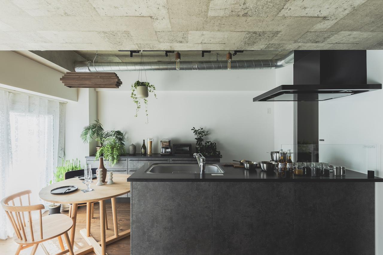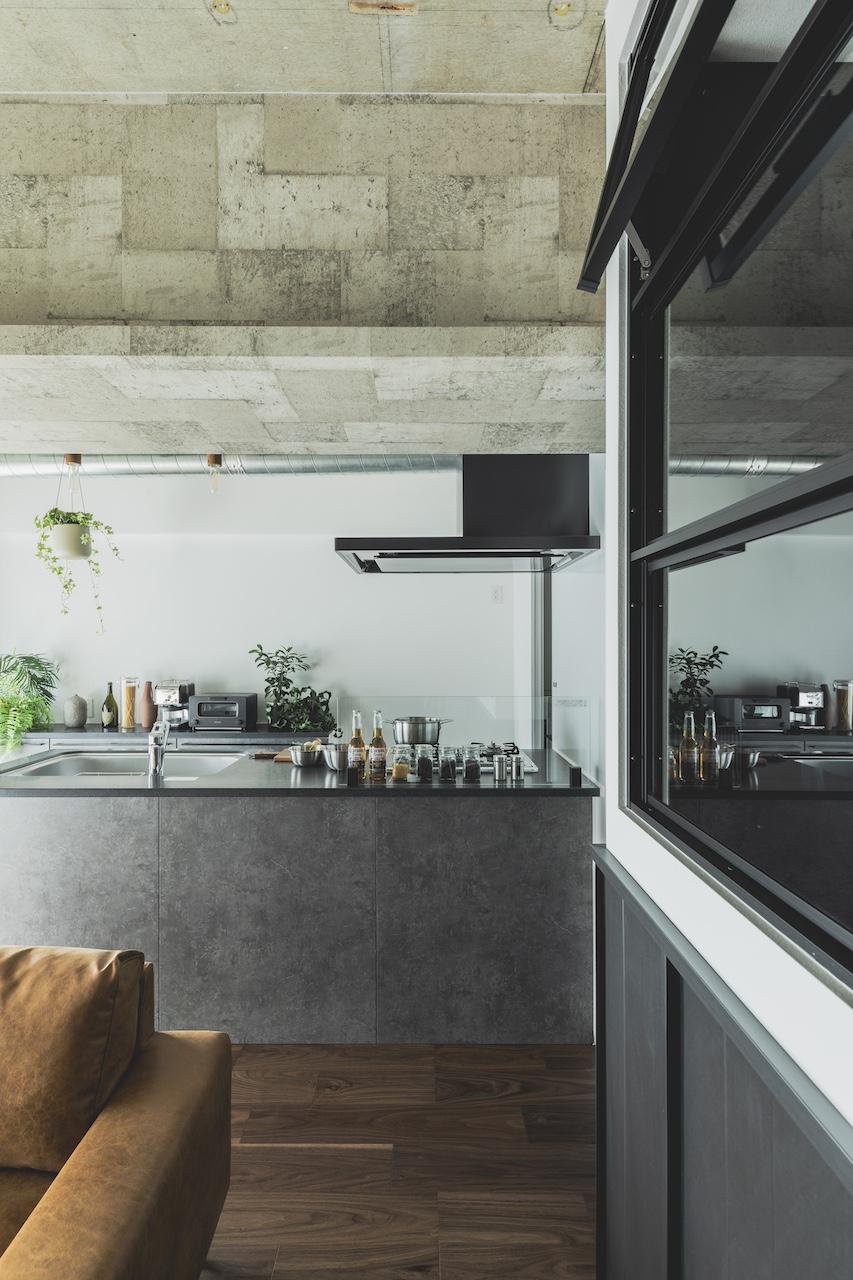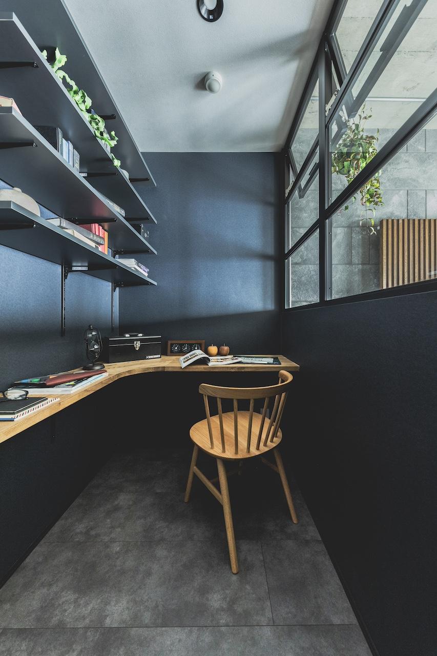 リビングのワークスペース側の壁面には、ガルバリウム鋼板を貼り空間のポイントにしました。 また、UTは造作バニティーで天板はデコリエ(モルタル調)にこだわっています。 対面式のキッチンは、ブラック天板を用いてスタイリッシュな雰囲気に。 施主様のこだわり空間で各所にポイントのある雰囲気の良いとても素敵なお家です。