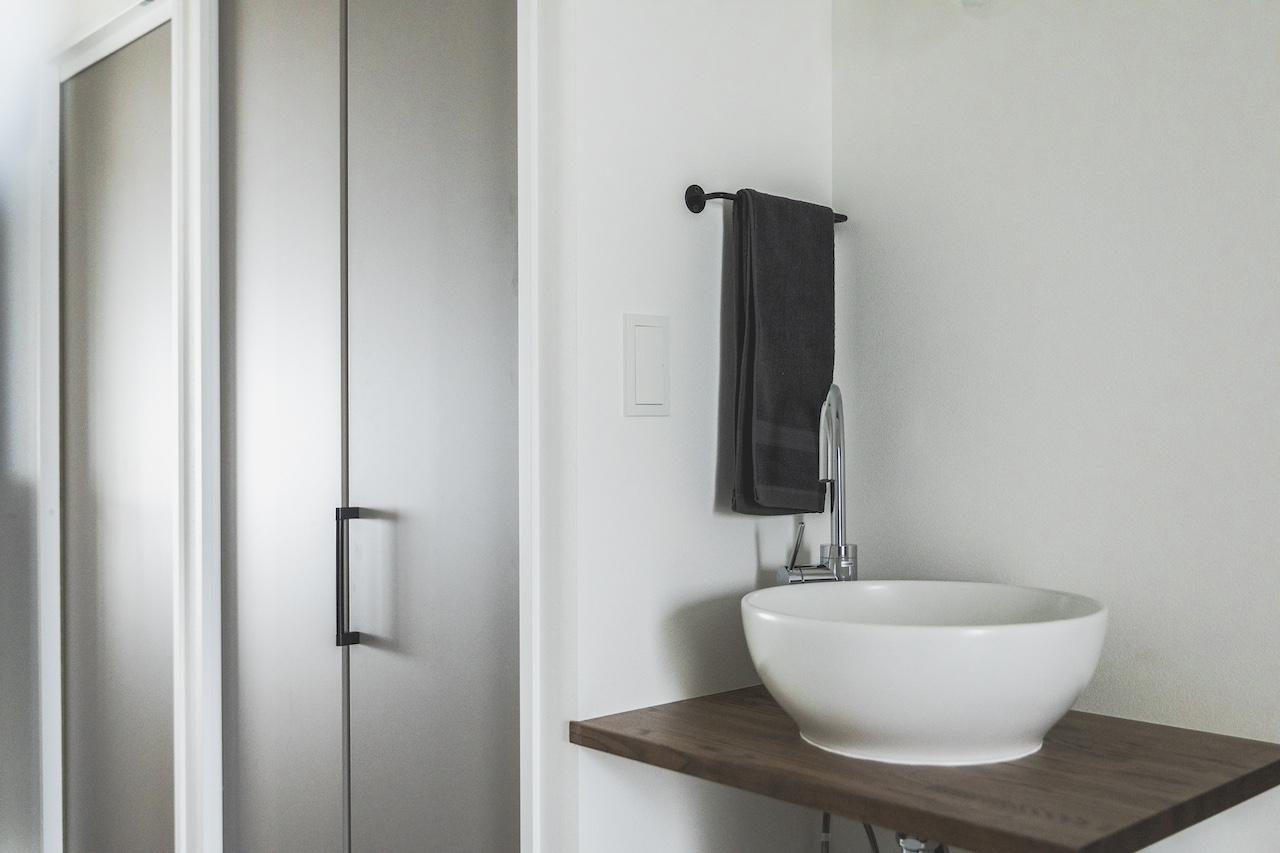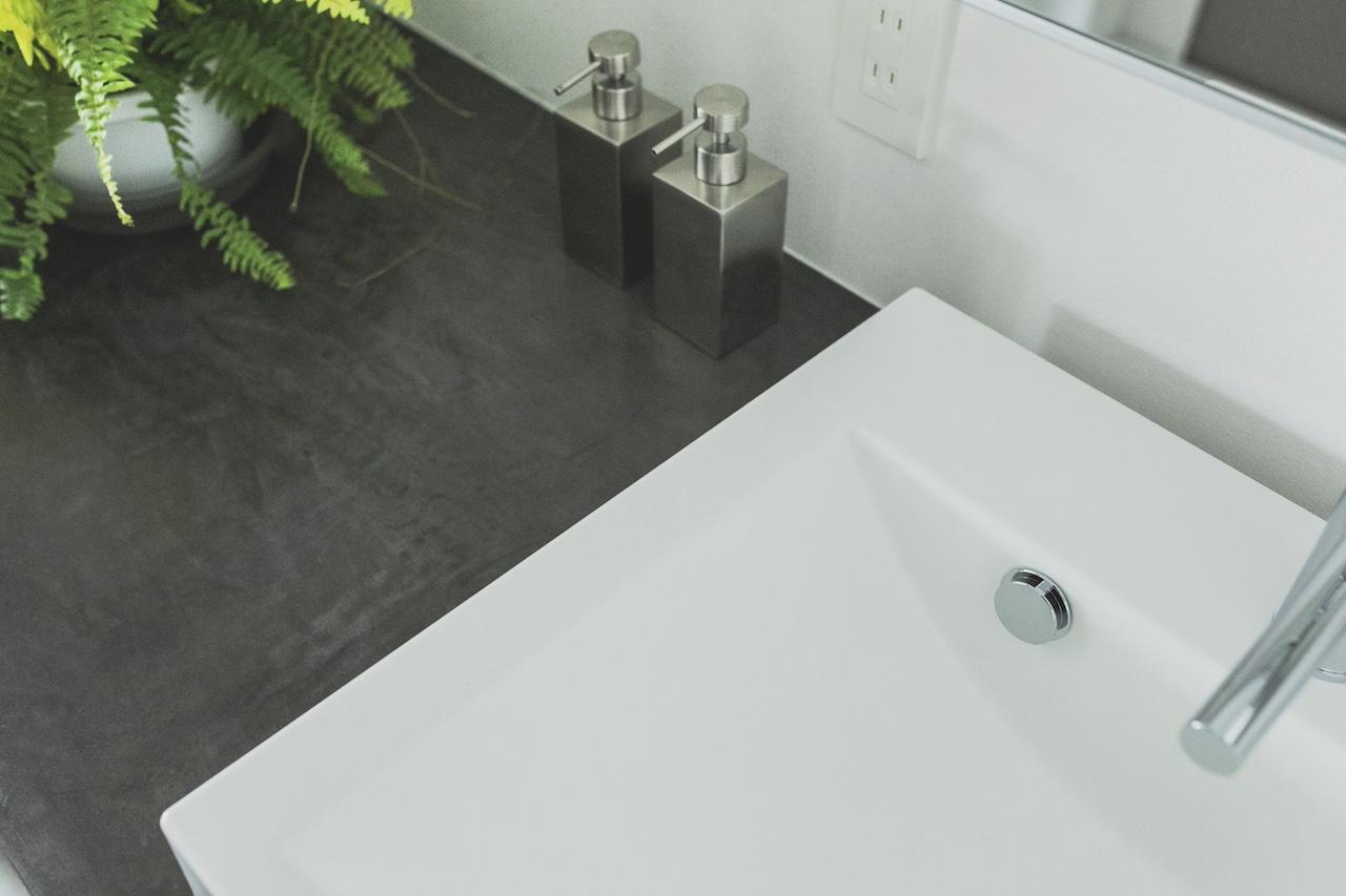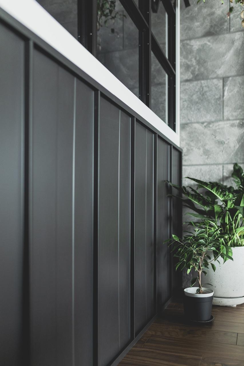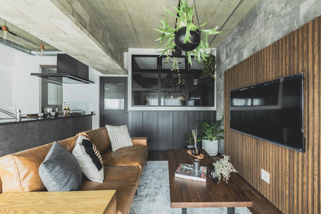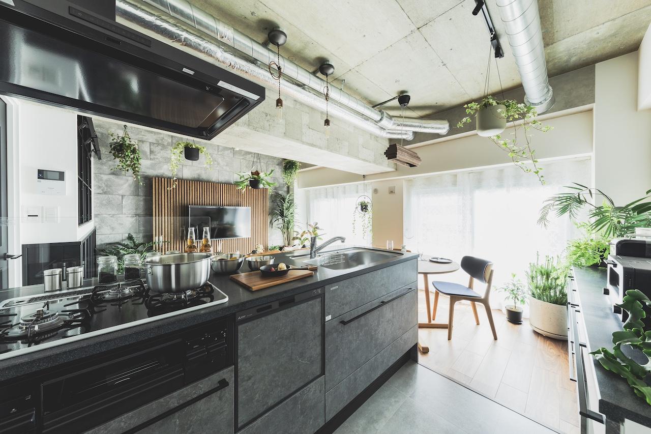 リビングのワークスペース側の壁面には、ガルバリウム鋼板を貼り空間のポイントにしました。 また、UTは造作バニティーで天板はデコリエ(モルタル調)にこだわっています。 対面式のキッチンは、ブラック天板を用いてスタイリッシュな雰囲気に。 施主様のこだわり空間で各所にポイントのある雰囲気の良いとても素敵なお家です。