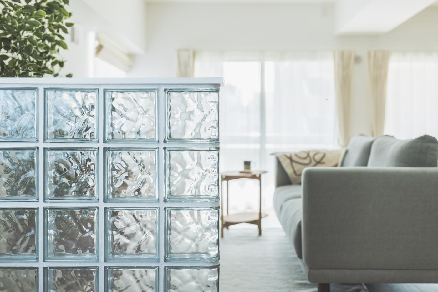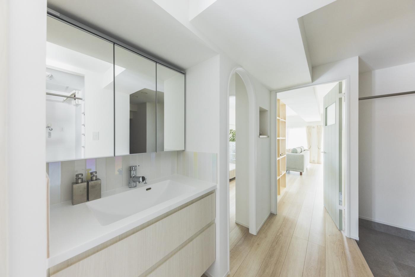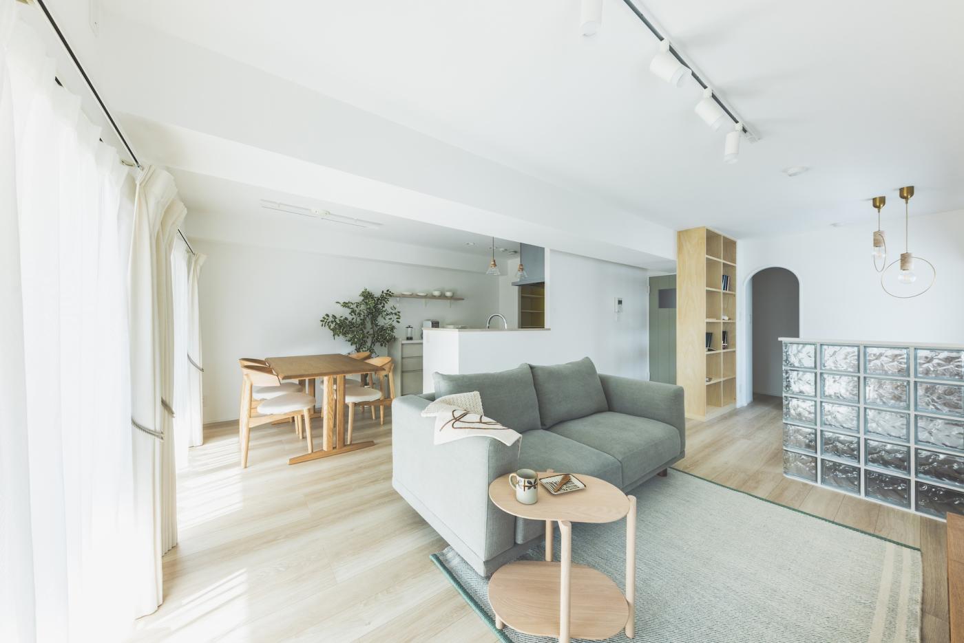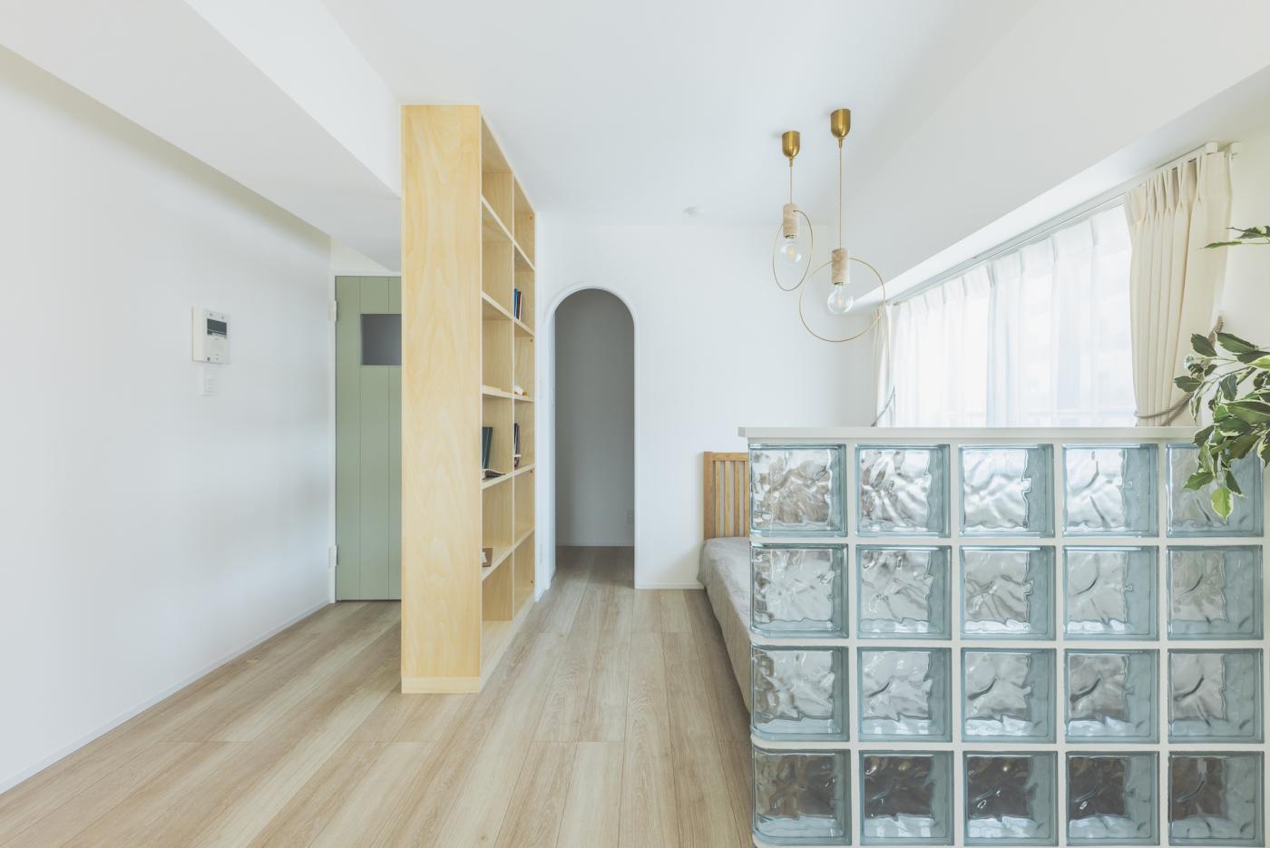 リビングとベッドルームをガラスブロックと本棚で仕切ることで、 居住空間を保ちつつ、抜け感を楽しめます。 アールの下がり天井や可愛らしい洗面化粧台、玄関の飾り棚など、 女性らしい見どころがいっぱい♪ 北欧スタイルのリノベをご覧ください。