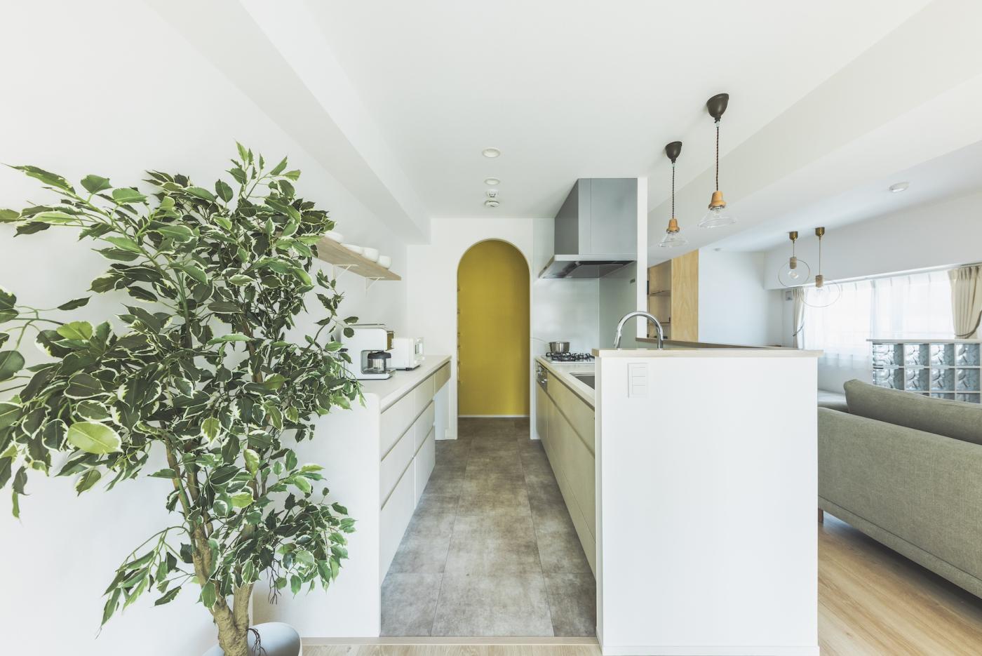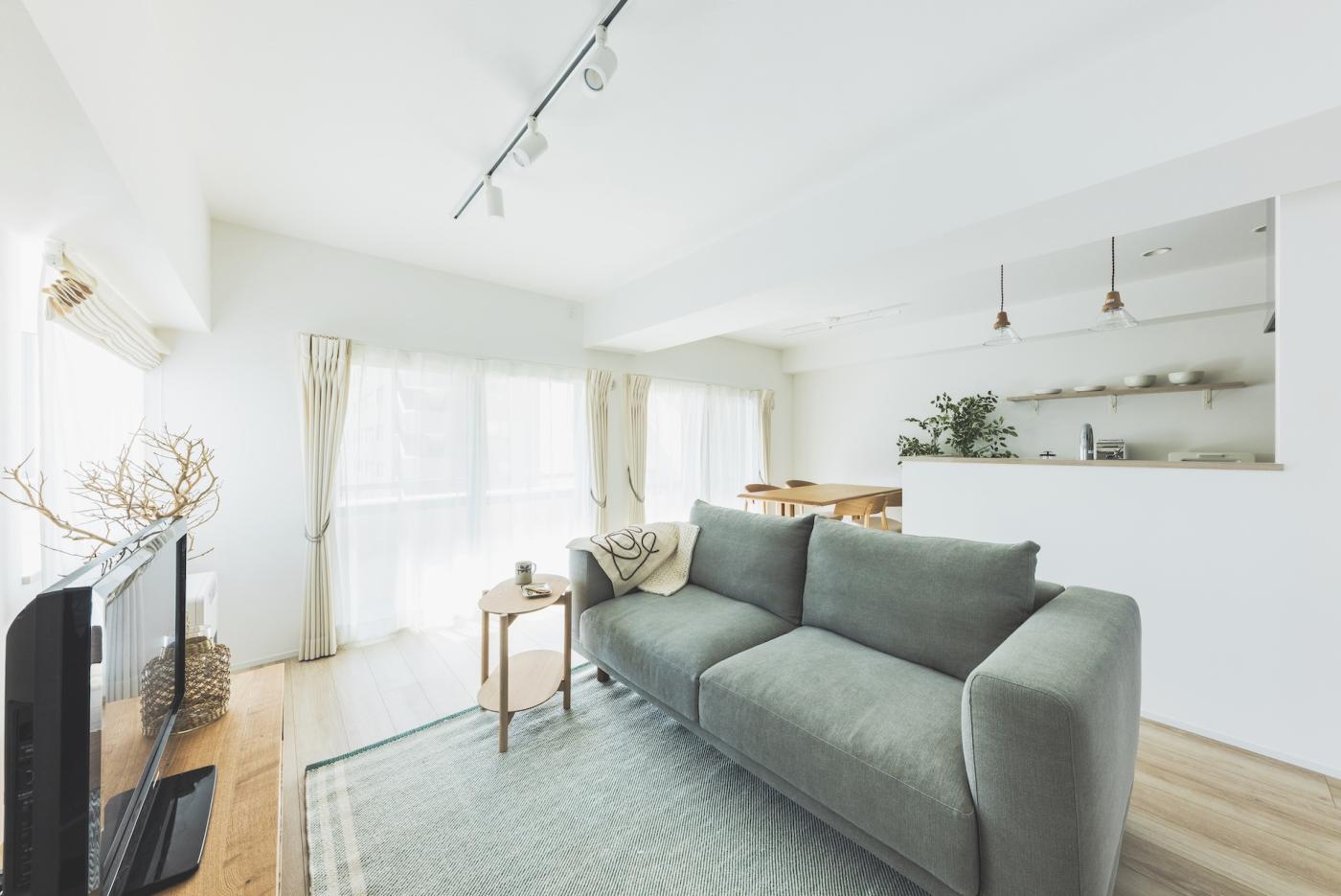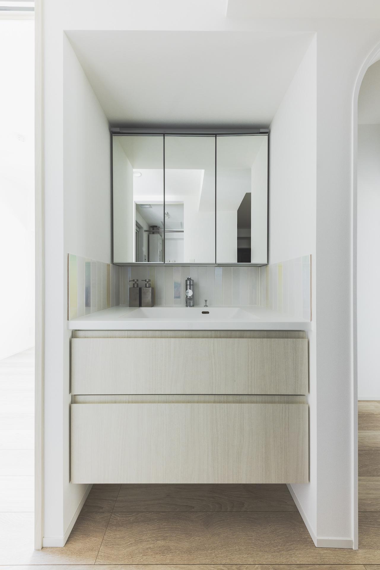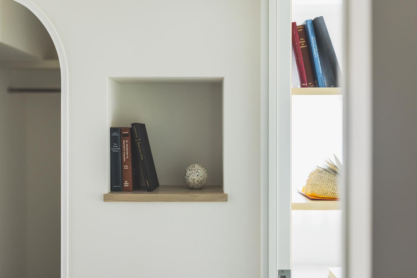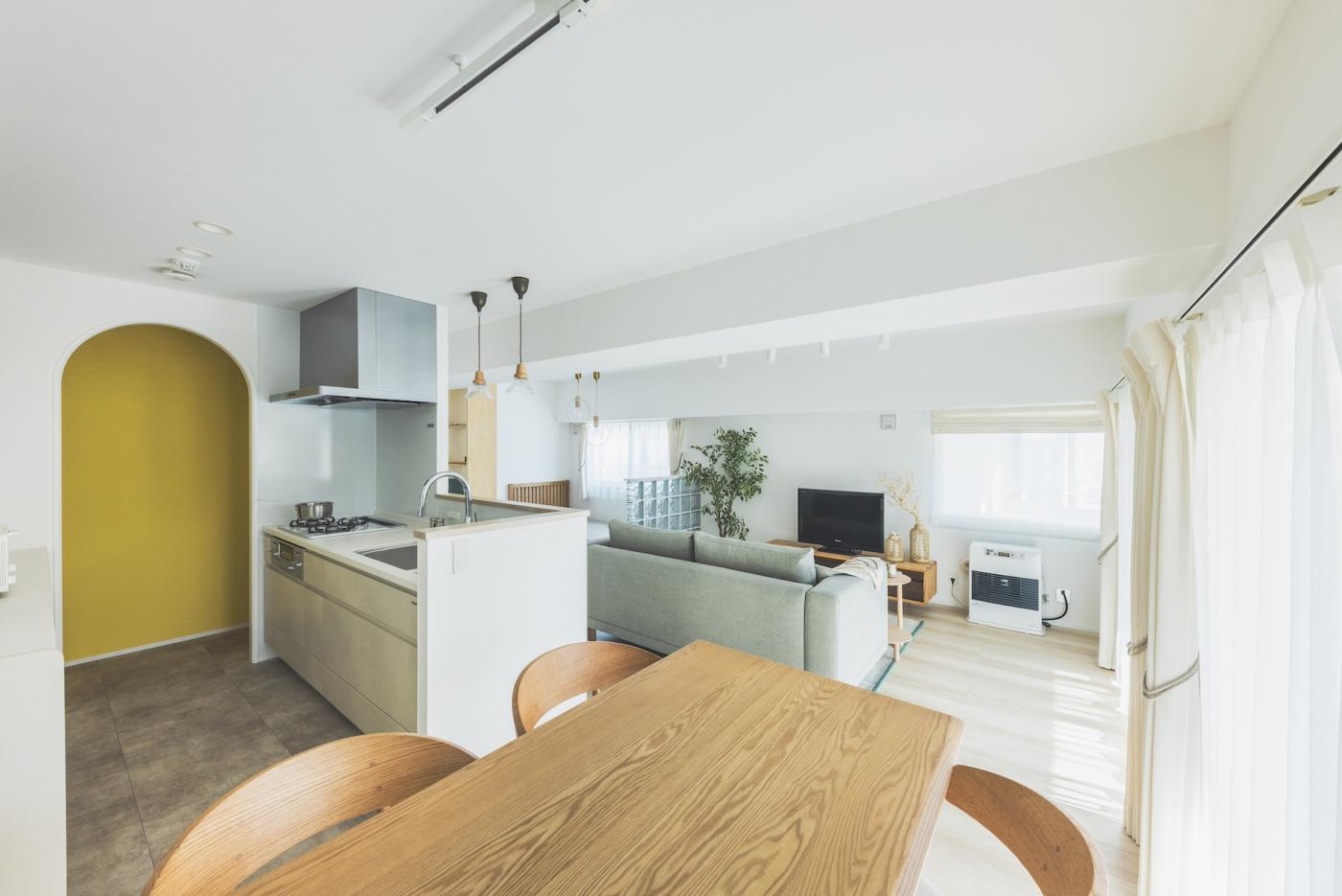 リビングとベッドルームをガラスブロックと本棚で仕切ることで、 居住空間を保ちつつ、抜け感を楽しめます。 アールの下がり天井や可愛らしい洗面化粧台、玄関の飾り棚など、 女性らしい見どころがいっぱい♪ 北欧スタイルのリノベをご覧ください。