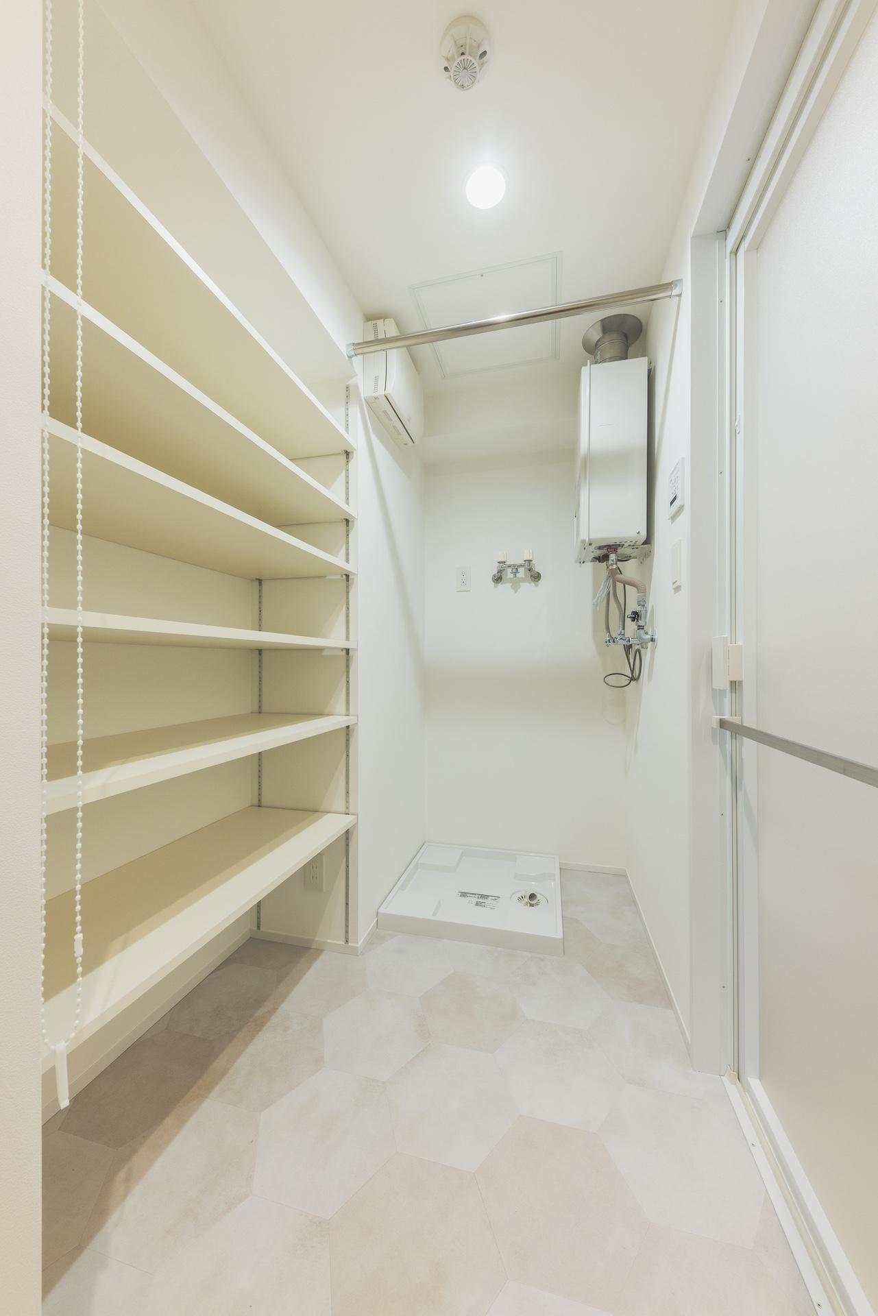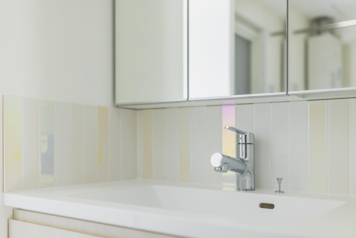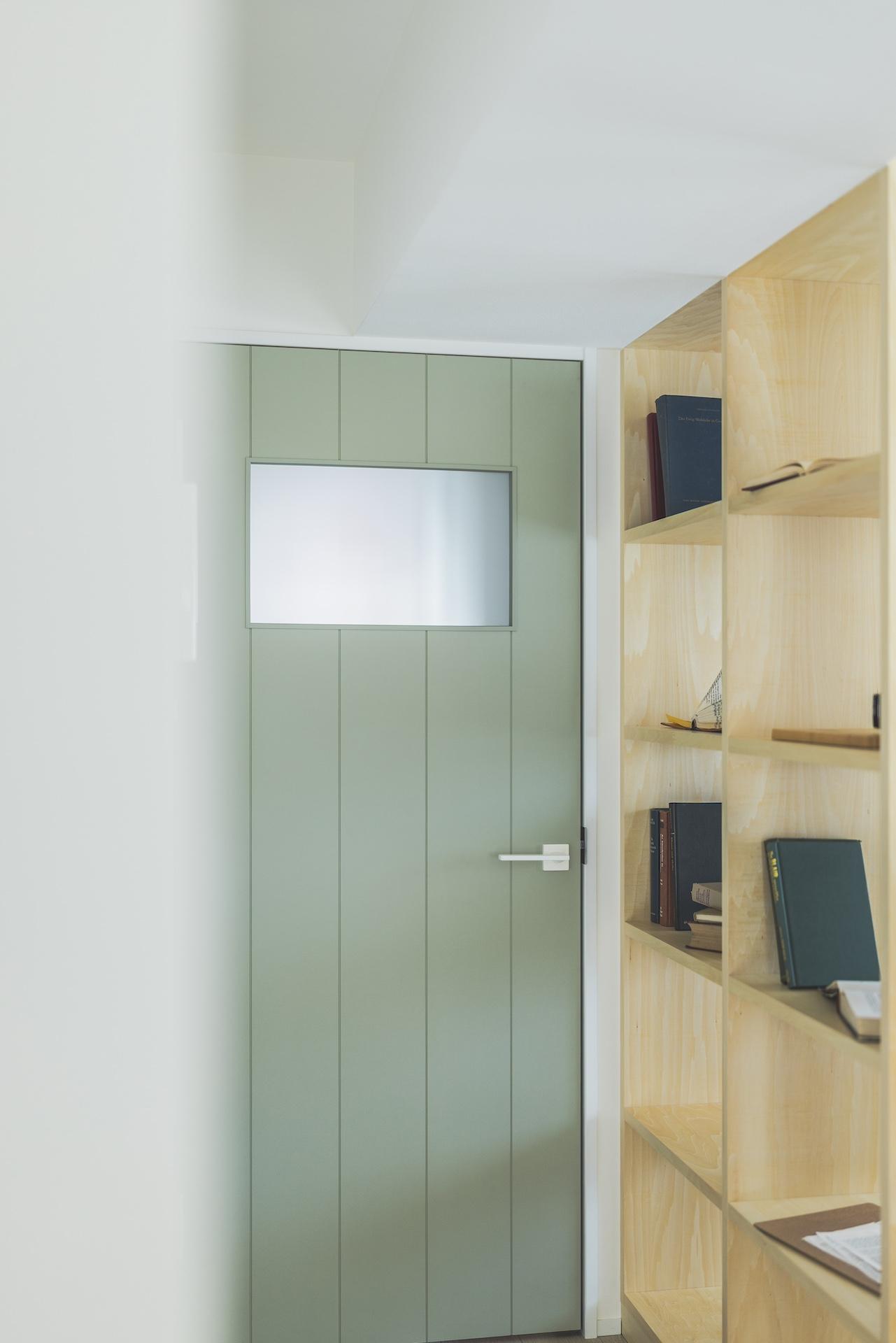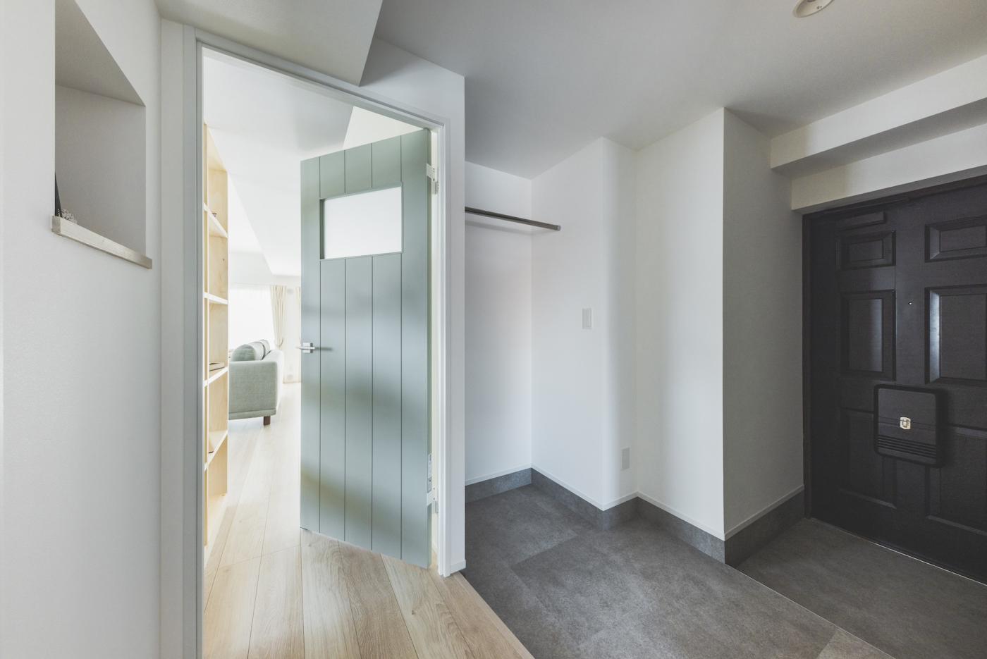 リビングとベッドルームをガラスブロックと本棚で仕切ることで、 居住空間を保ちつつ、抜け感を楽しめます。 アールの下がり天井や可愛らしい洗面化粧台、玄関の飾り棚など、 女性らしい見どころがいっぱい♪ 北欧スタイルのリノベをご覧ください。