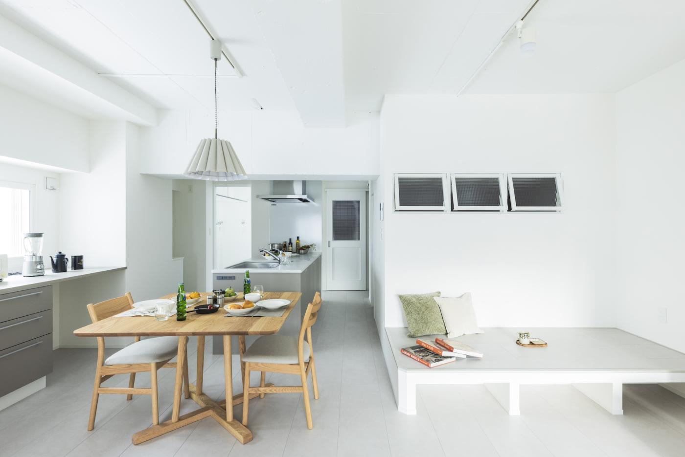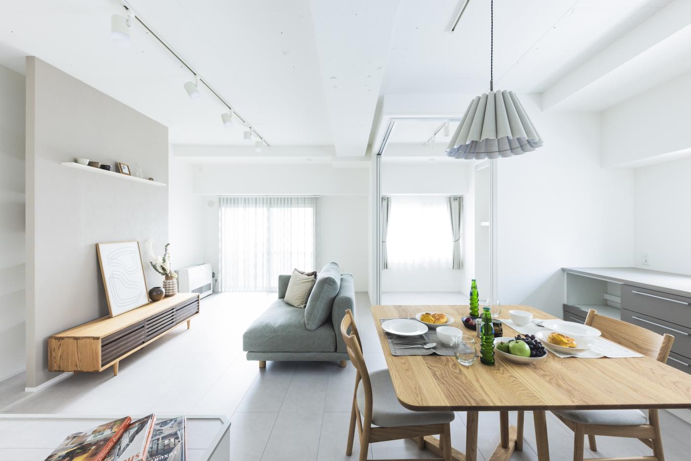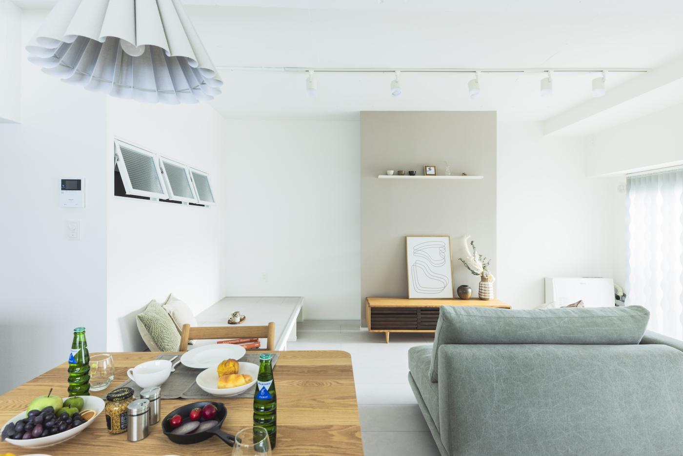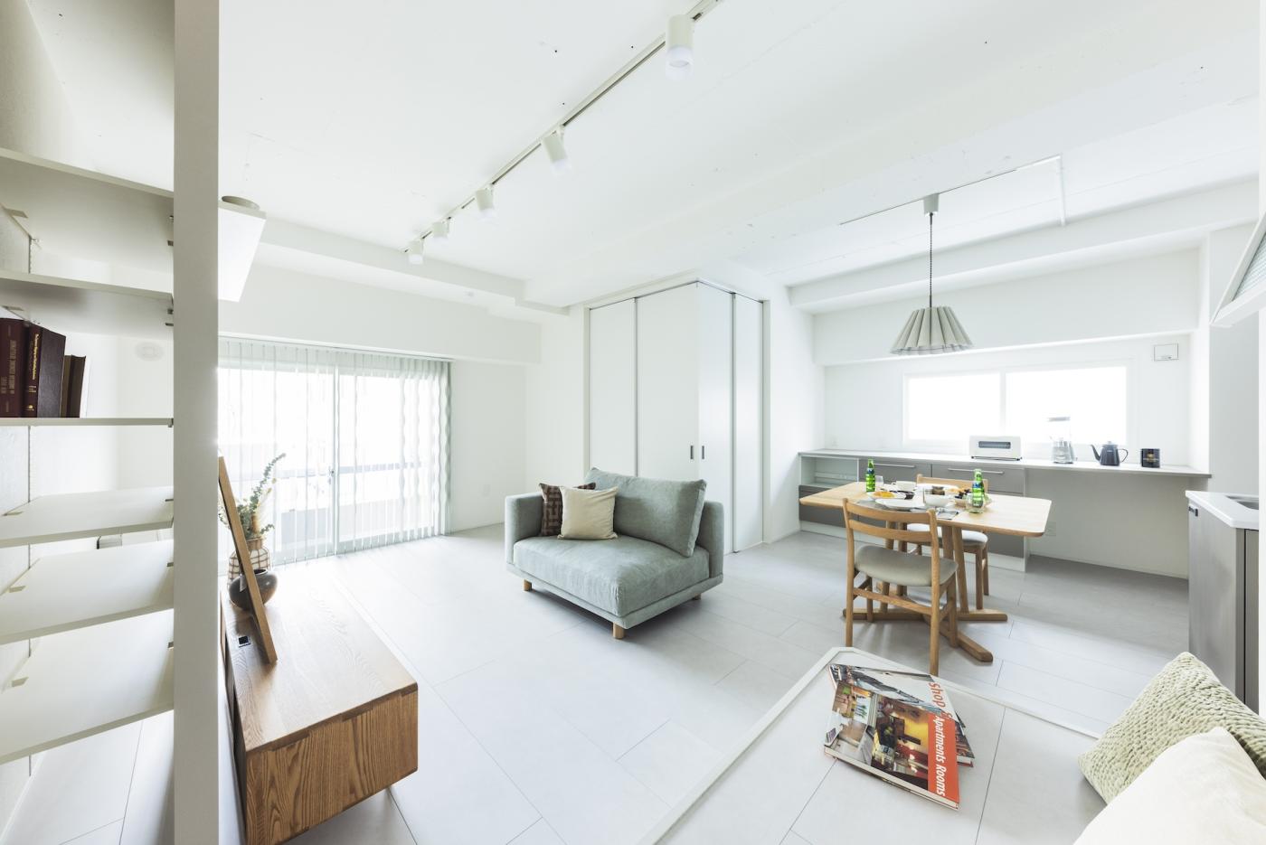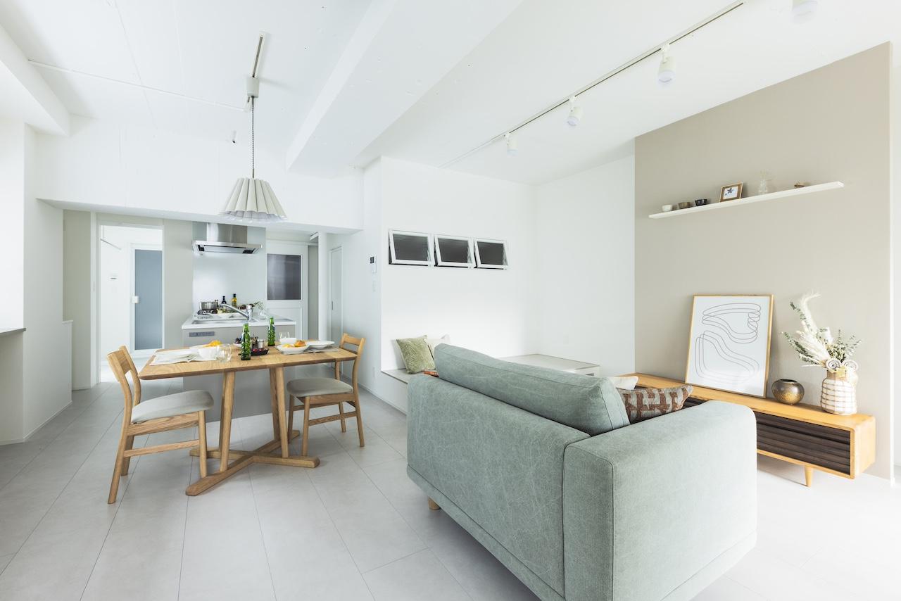 20帖のLDKとフリールームを隣接させることで、 開放感と広さを確保しました。 2600mmの天井高は、視覚的にも広さを感じることができます。 女性ならではの優しいリノベ空間を、ぜひご覧ください。