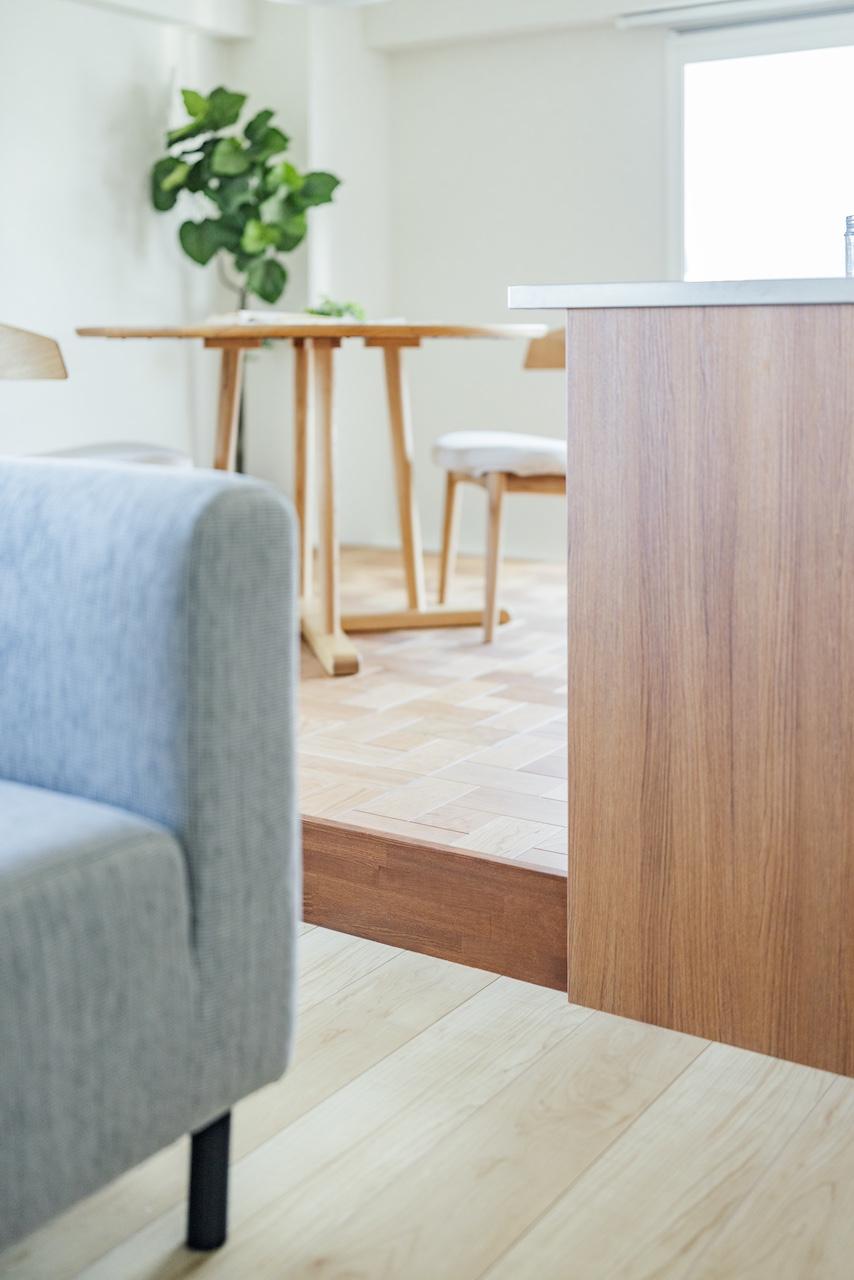 ゾーン分けを意識して、あえて段差を設けたダイニングはパーケット柄のフロアで印象的に。