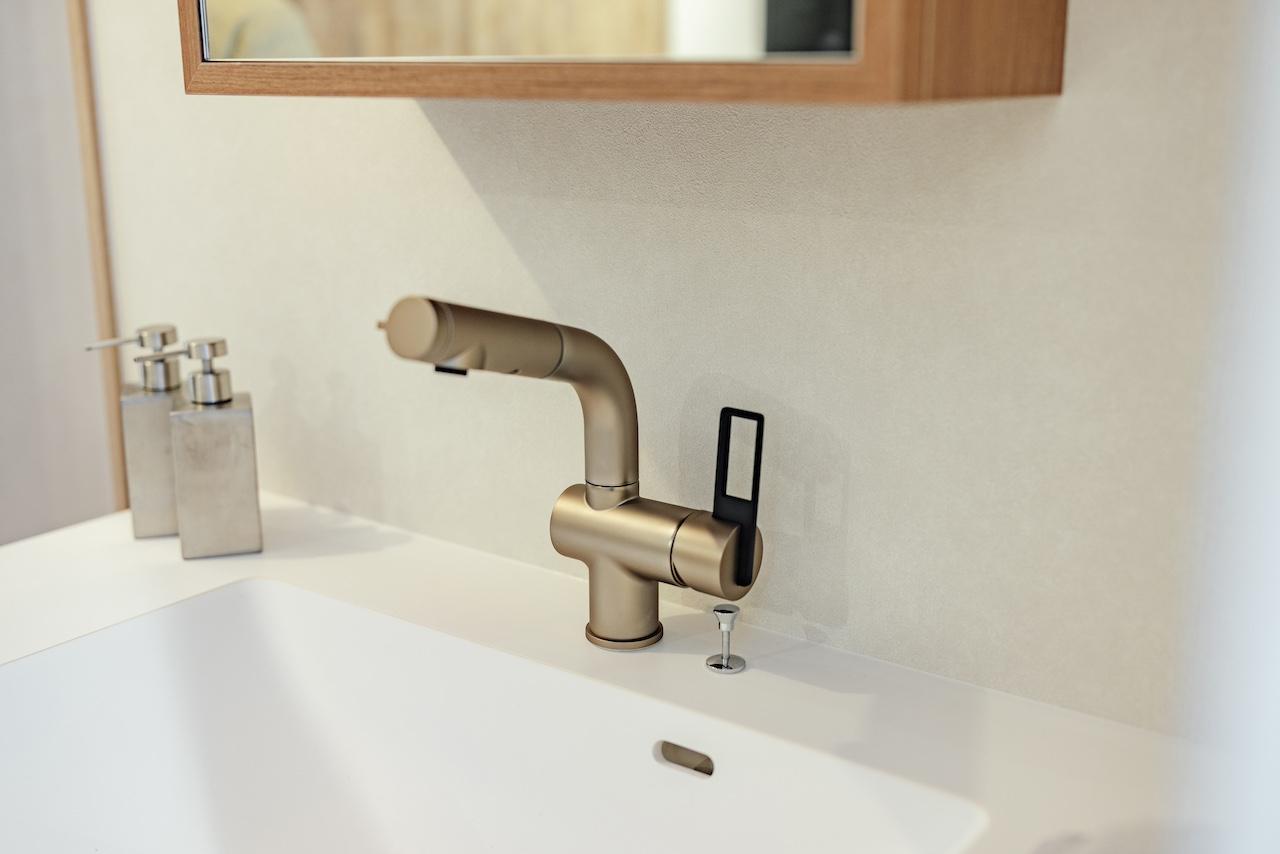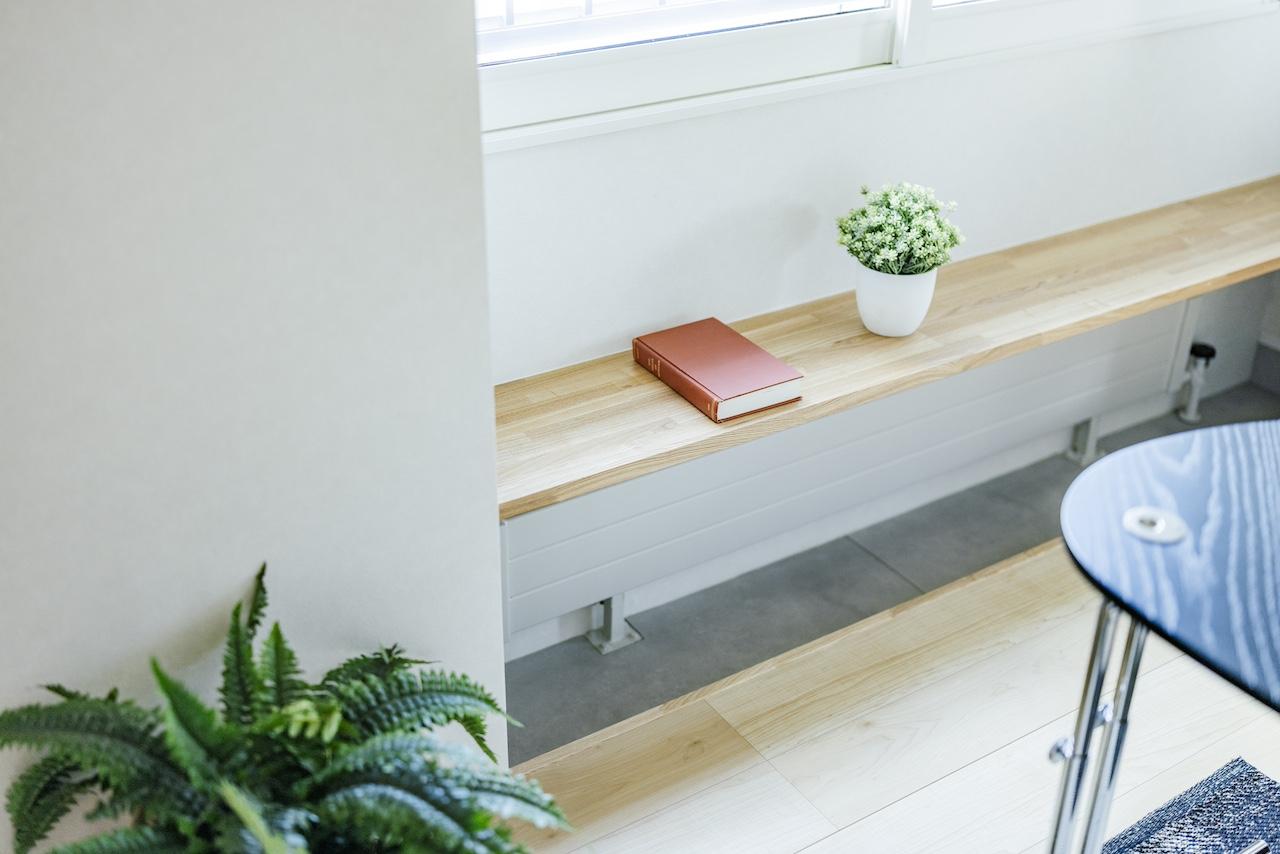 赤味ある木目とナチュラルな木目が、メリハリのある空間に演出。