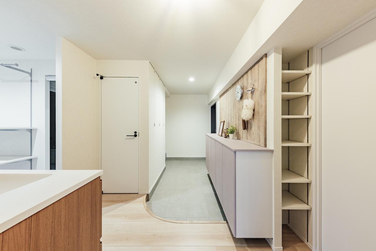 ご夫婦で飾ることを楽しむため、大きな造作棚を設けて、住まいの中心に配置しました。