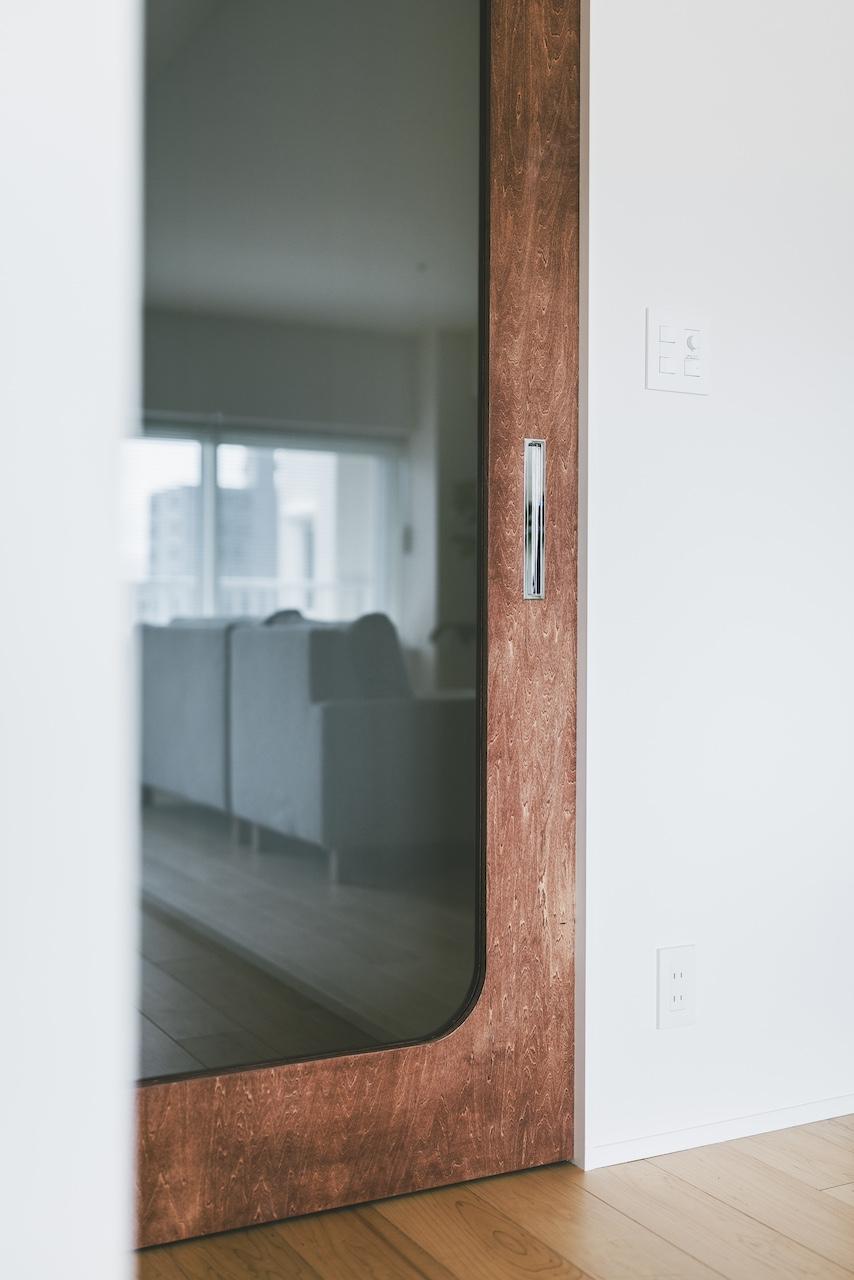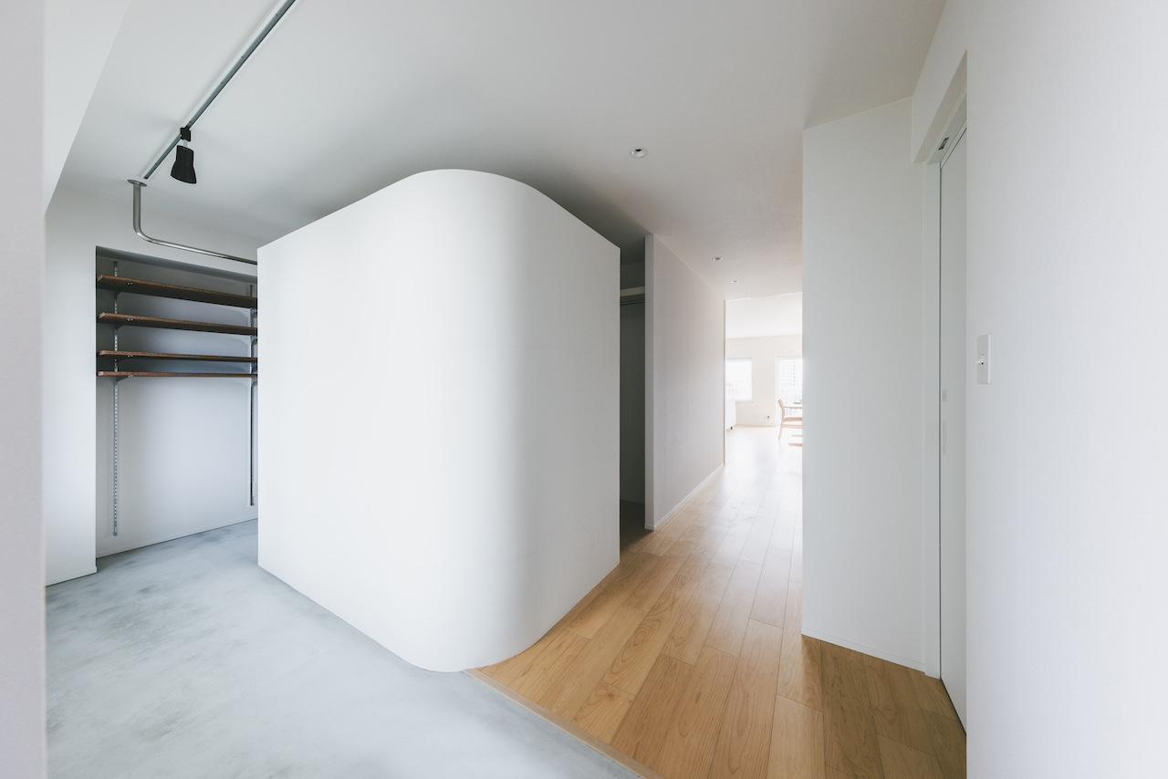 幅1mの迫力のあるリビングドア、抜け感のあるR壁、キッチン・洗面のタイル貼りなど
